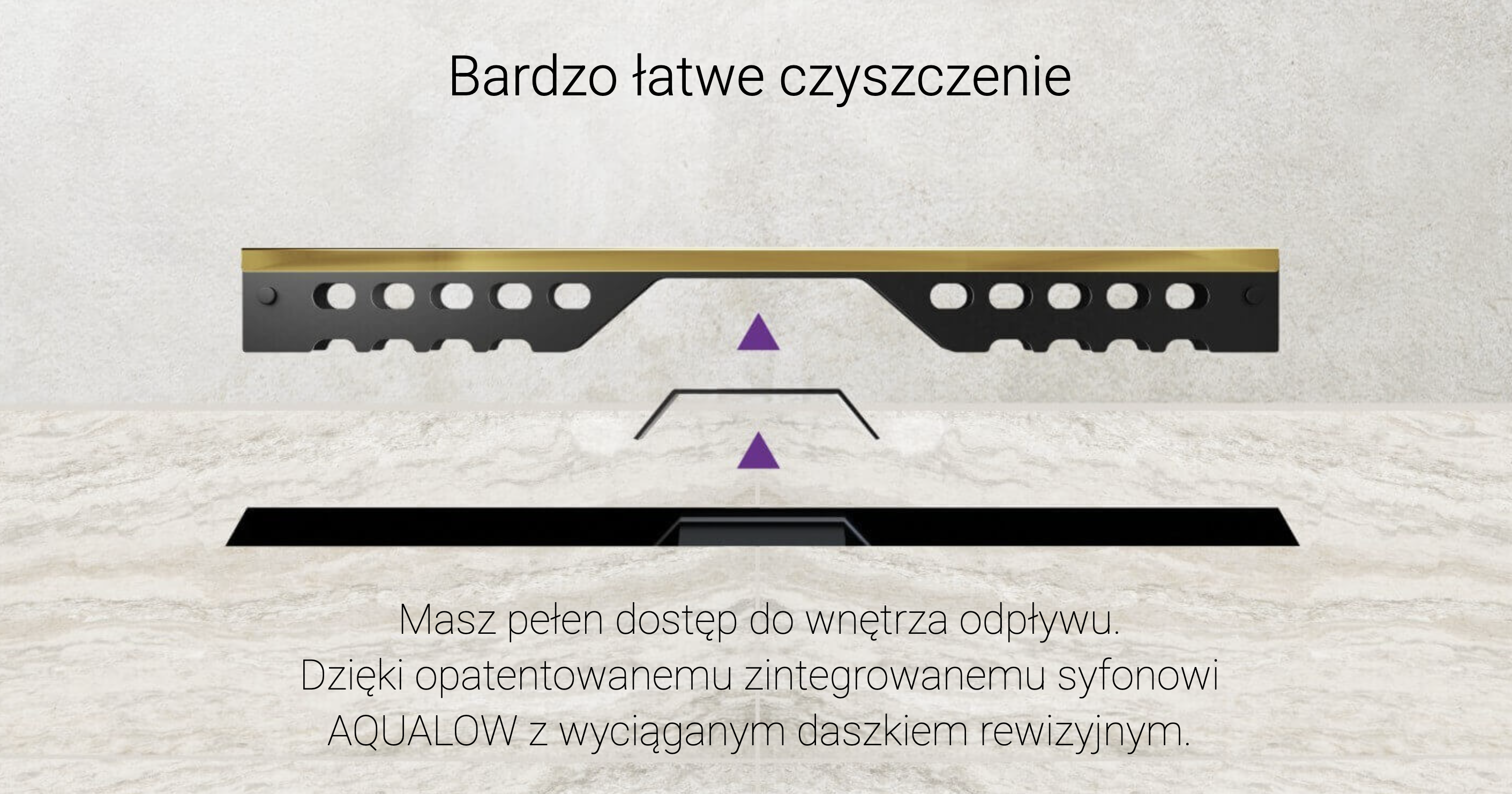 Prawidłowo wykonana izolacja pozwoli na komfortowe użytkowanie łazienki przez wiele lat. Kluczowe jest regularne czyszczenie samego odpływu liniowego (zalecane co 14 dni) oraz kontrola drożności syfonu. Opatentowane syfony AQUALOW w serii PREMIUM oraz SMART CED'OR umożliwiają łatwy dostęp do elementów serwisowych - syfon jest zintegrowany z odpływem, a specjalny daszek rewizyjny można łatwo wyjąć i w każdej chwili uzyskać pełny dostęp bezpośrednio do wnętrza syfonu, co znacząco ułatwia jego konserwację.
