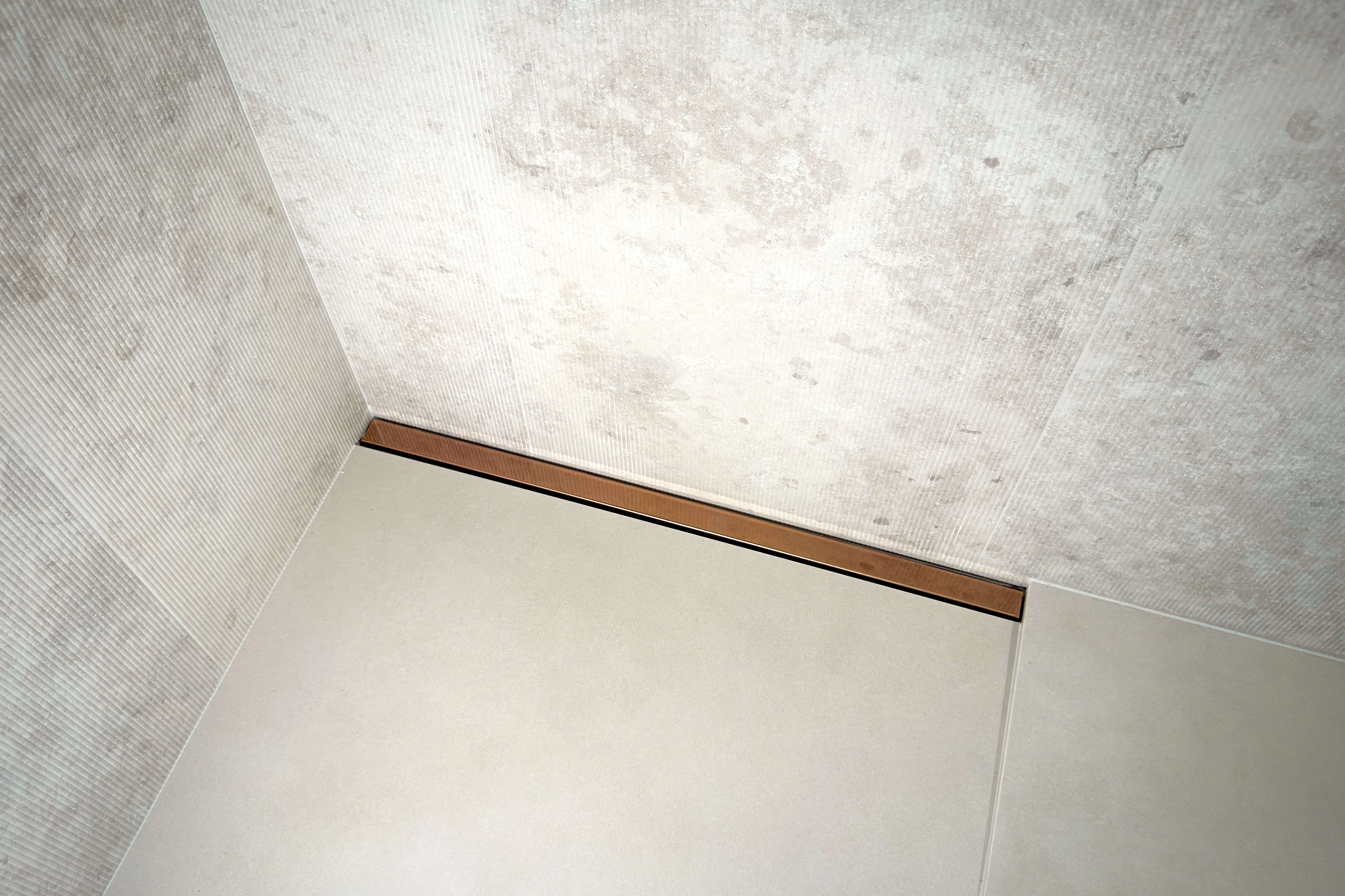 Odpływ przyścienny LINE PRO Chrome Rose Gold - ciepło różowego złota w błyszczącym wydaniu.