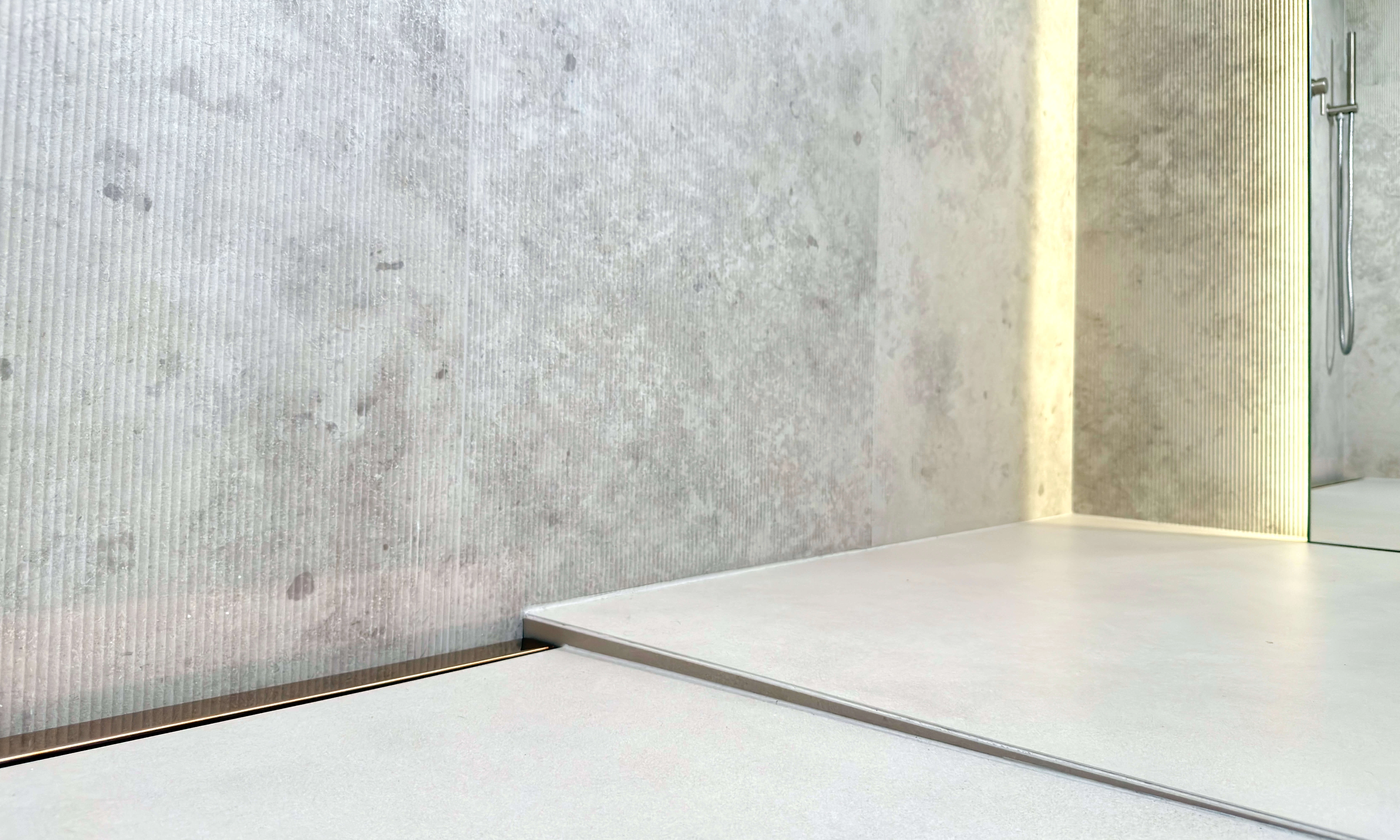 W wersji przyściennej poszliśmy o krok dalej. Specjalnie wygięta ku górze flansza (kołnierz) pozwala na dosunięcie odpływu bezpośrednio do ściany. To rozwiązanie eliminuje konieczność stosowania wąskich docinek płytek za odpływem, czy montażu “w kopertę”, umożliwiając instalację na pełną szerokość prysznica i wykonanie idealnego spadku jednospadowego. Twoja podłoga pozostaje jednolita aż do samej krawędzi. Dodatkowo, bezramkowa konstrukcja sprawia, że woda dosłownie znika w posadzce. Nie ma żadnych wystających elementów, żadnych niepotrzebnych dodatków.